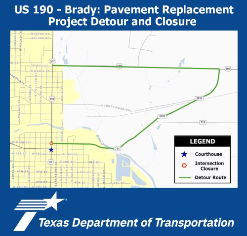 Beginning Tuesday, April 14, TxDOT’s contractor plans to close the intersection of US 190/US 377 (Bridge Street) at Main Street, just north of the McCulloch County Courthouse, to begin a pavement replacement project.