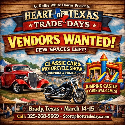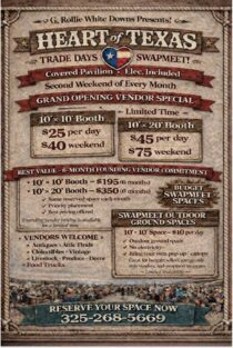 HomeEventsHeart of Texas Trade Days Heart of Texas Trade Days SHARE NOW Sat, Mar 14 at 8:00am - Sun, Mar 15 at 6:00pm Add to My Calendar